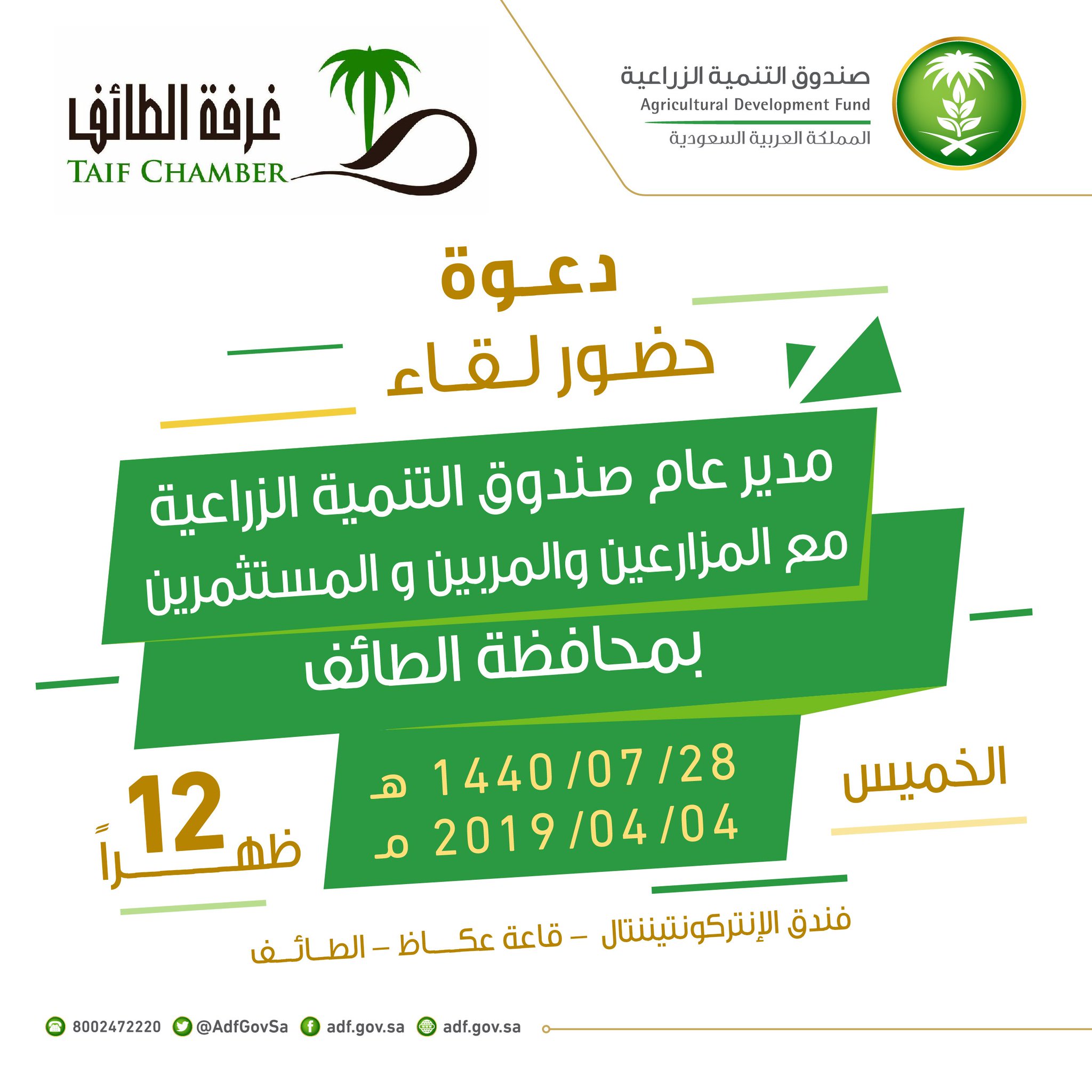 صندوق التنمية الزراعية On Twitter يسر صندوق التنمية الزراعية دعوتكم لحضور لقاء مدير عام الصندوق مع المزارعين و المربين والمستثمرين والمهتمين بالقطاع الزراعي وذلك بمحافظة الطائف يوم الخميس 28 7 1440هـ في فندق الأنتركونتننتال Https T Co 2l6bxbh0r9
