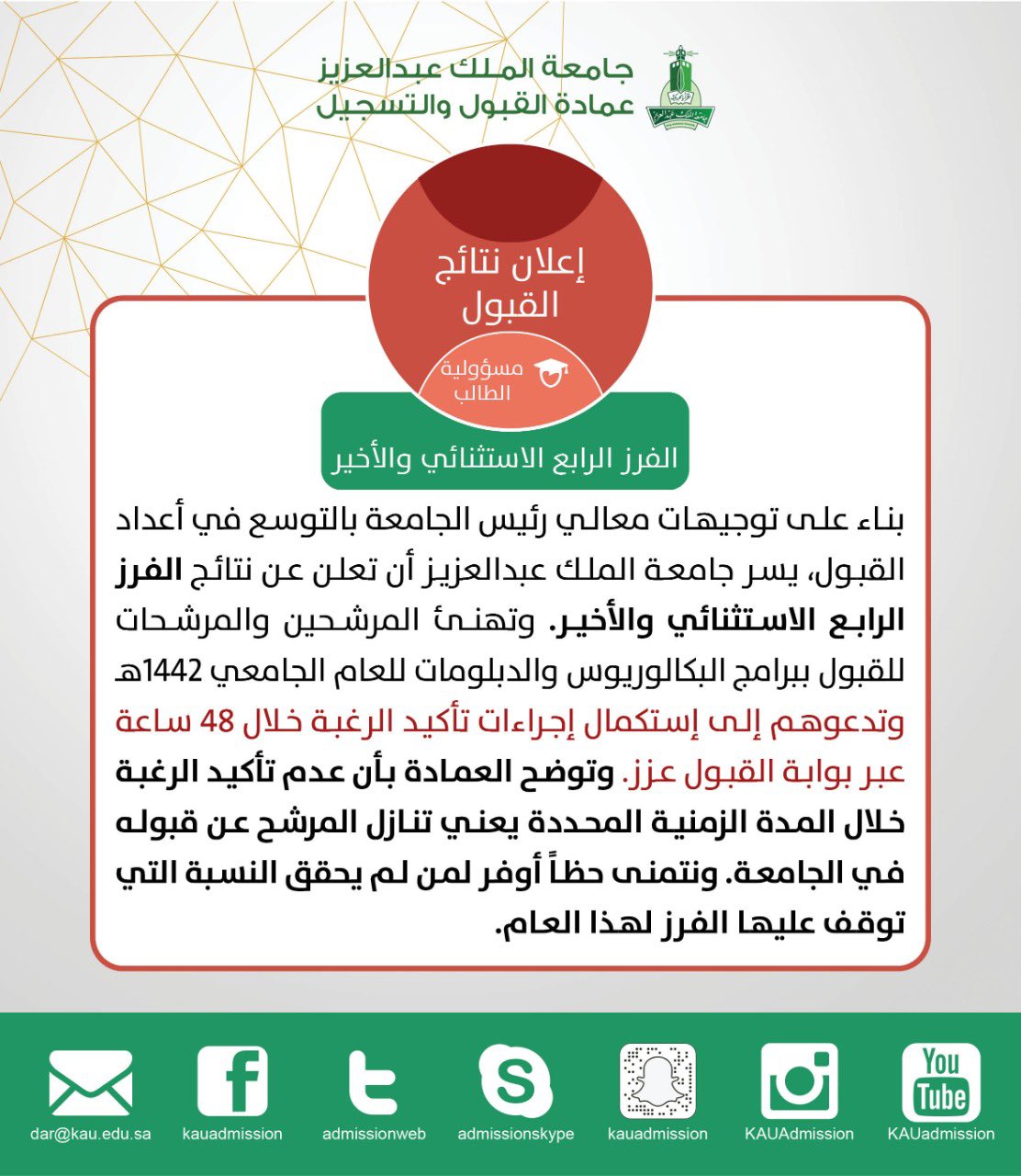 عمادة القبول والتسجيل Kau On Twitter بناء على توجيهات معالي رئيس جامعة الملك العزيز أ د عبدالرحمن اليوبي تعلن العمادة الفرز الرابع الاستثنائي والأخير للقبول ببرامج البكالوريوس والدبلومات للعام ١٤٤٢هـ ببوابة القبول Https T Co Eyzipkhrnc ويجب