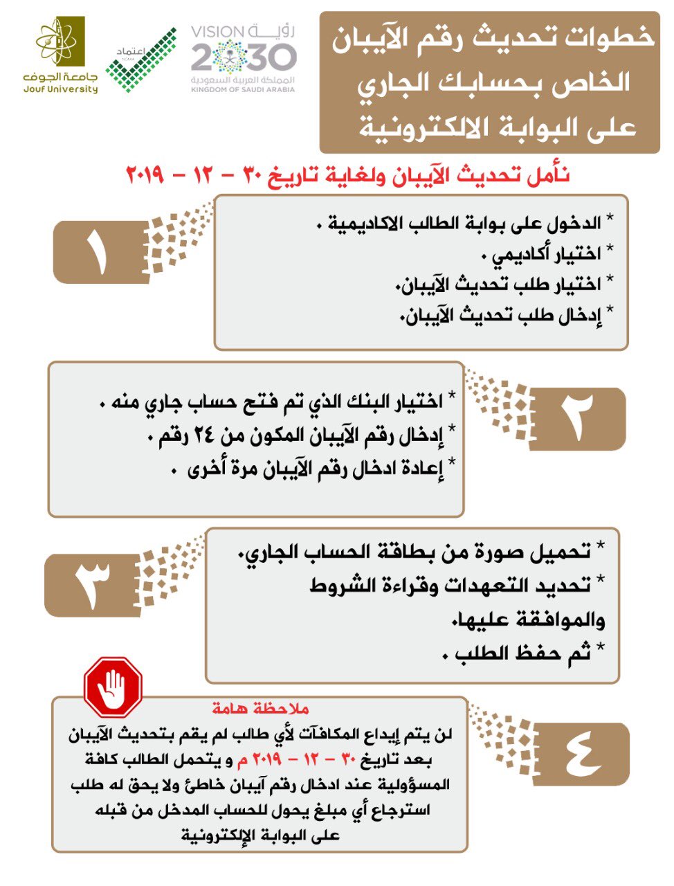 جامعة الجوف On Twitter هام عمادة القبول والتسجيل تدعو جميع طلبة جامعة الجوف لسرعة تحديث رقم الآيبان في البوابة الإلكترونية قبل تاريخ 30 12 2019 وفقا للمرفق علاقة الجامعة بالمجتمع رؤية السعودية 2030 Https T Co 9i1y3hdjnv